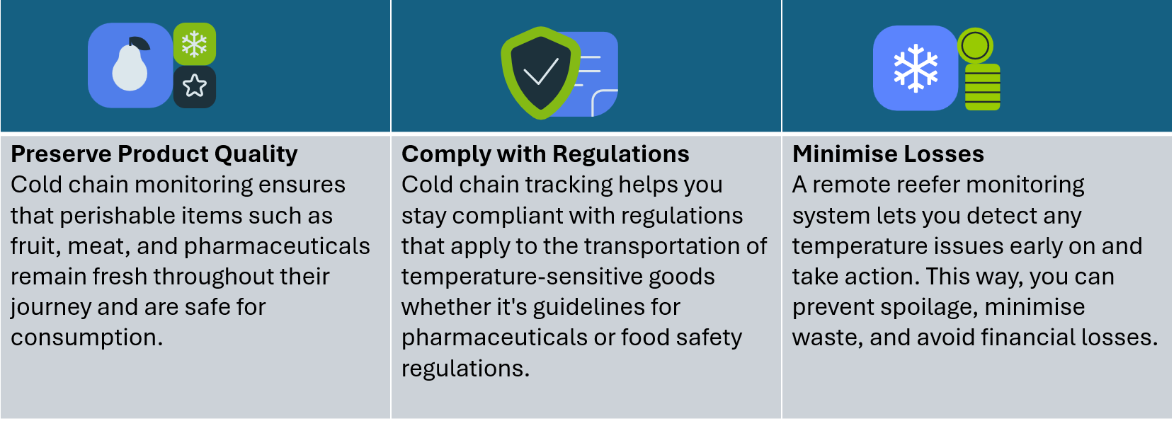 Making sure temperature-sensitive products reach their destination fresh and safe for consumption. Use cold chain monitoring to transport perishables at the right temperature and eliminate the risk of human error.
